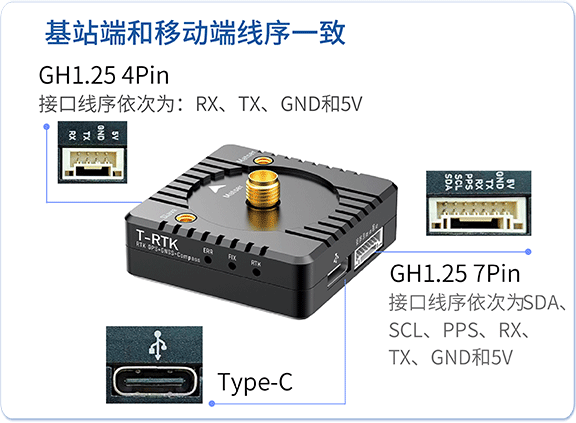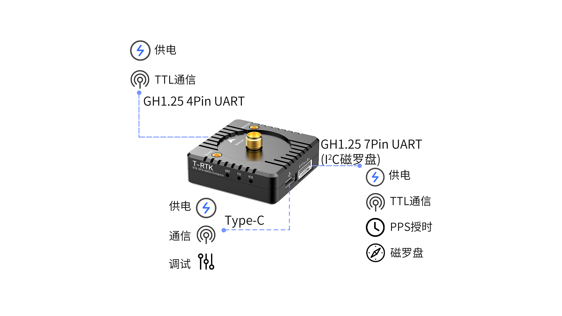 集成Type-C(供电/调试/通信三合一)、双串口(4Pin基础通信+7Pin飞控接口)、PPS精准授时与I²C直连磁罗盘。