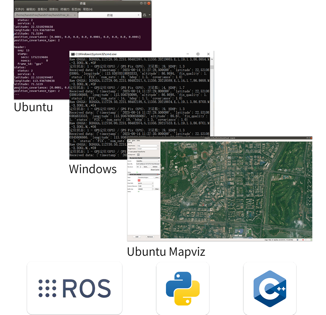 提供ROS、Python、C++驱动,方便获取经纬高、速度、航向等数据,快速进行二次开发。